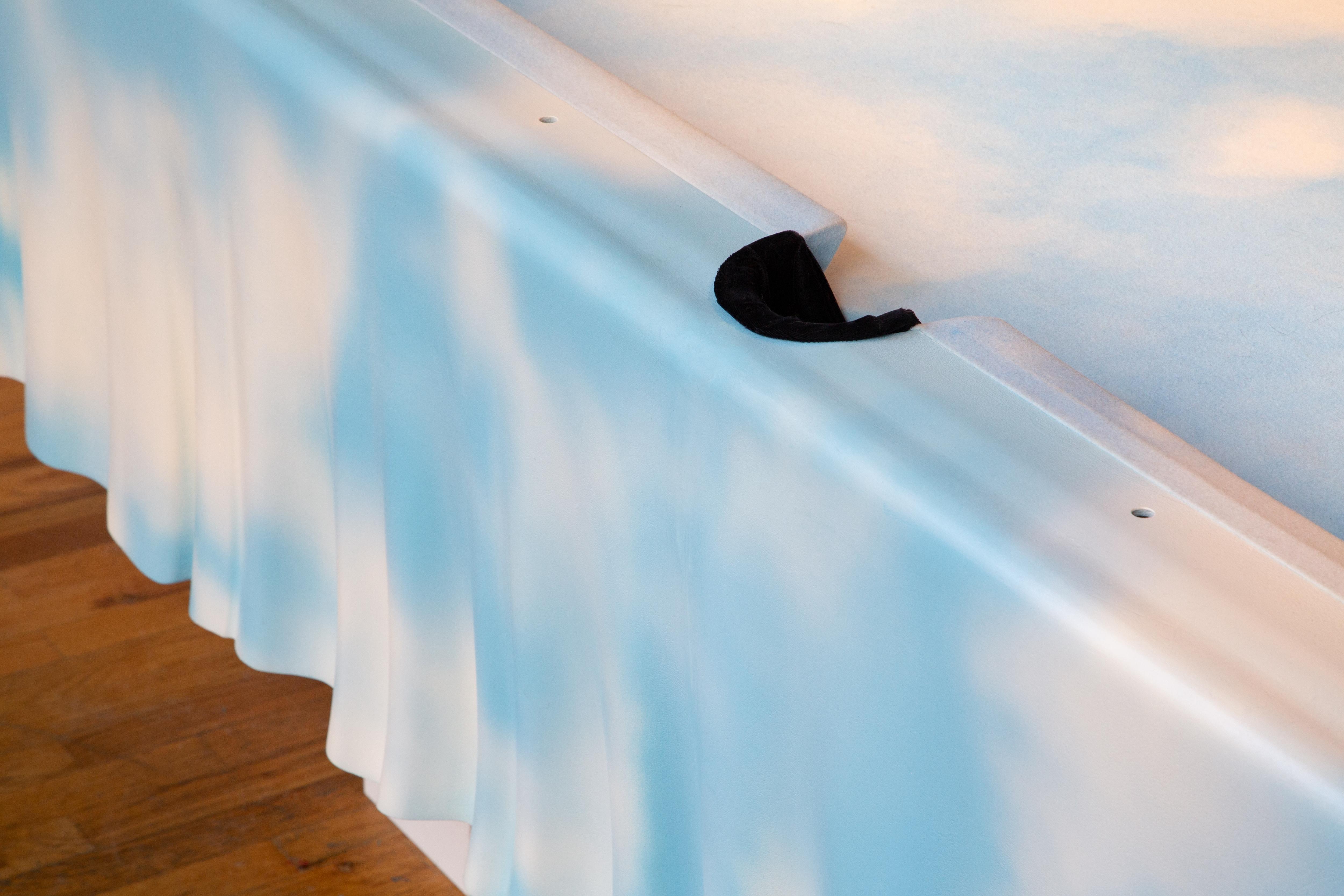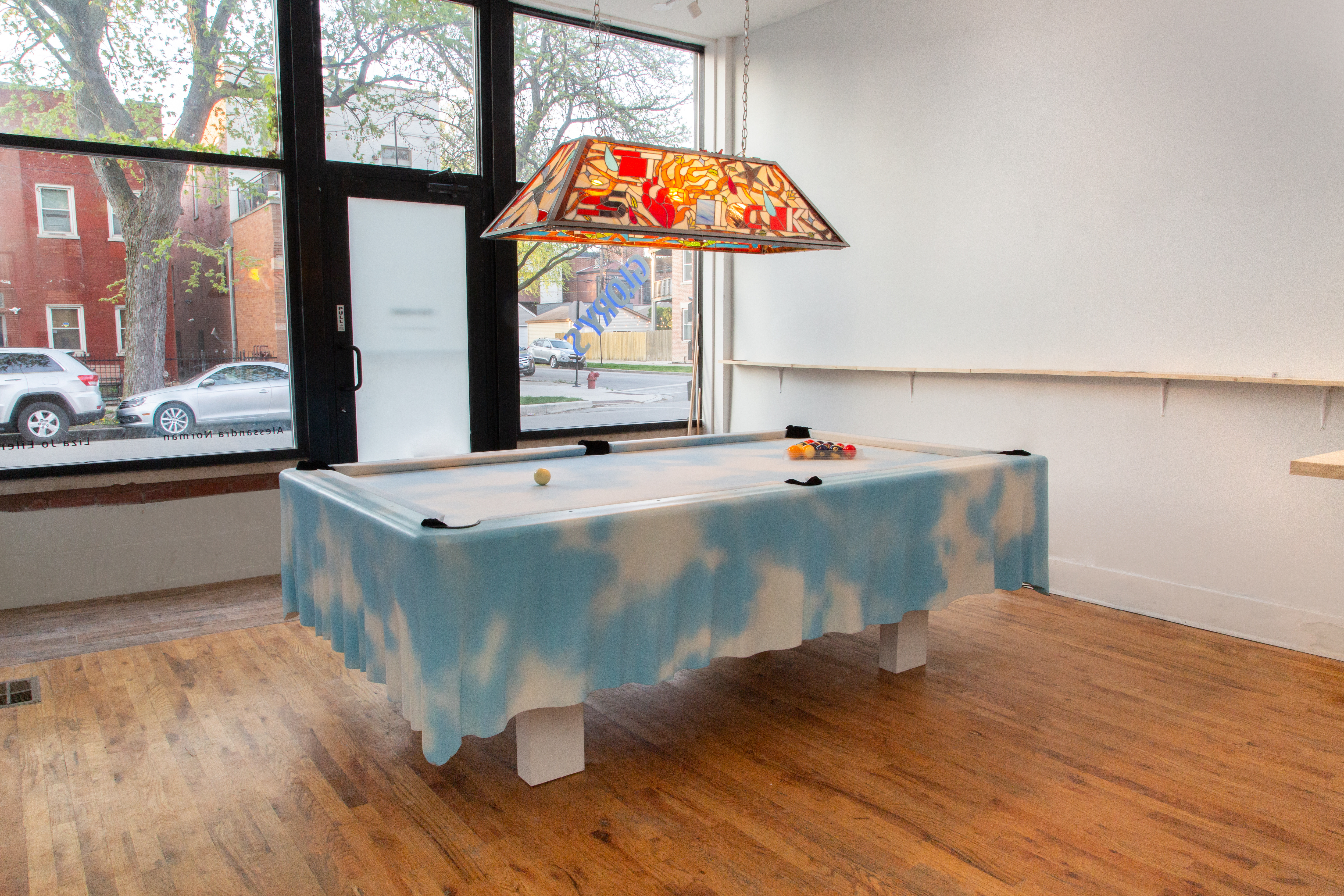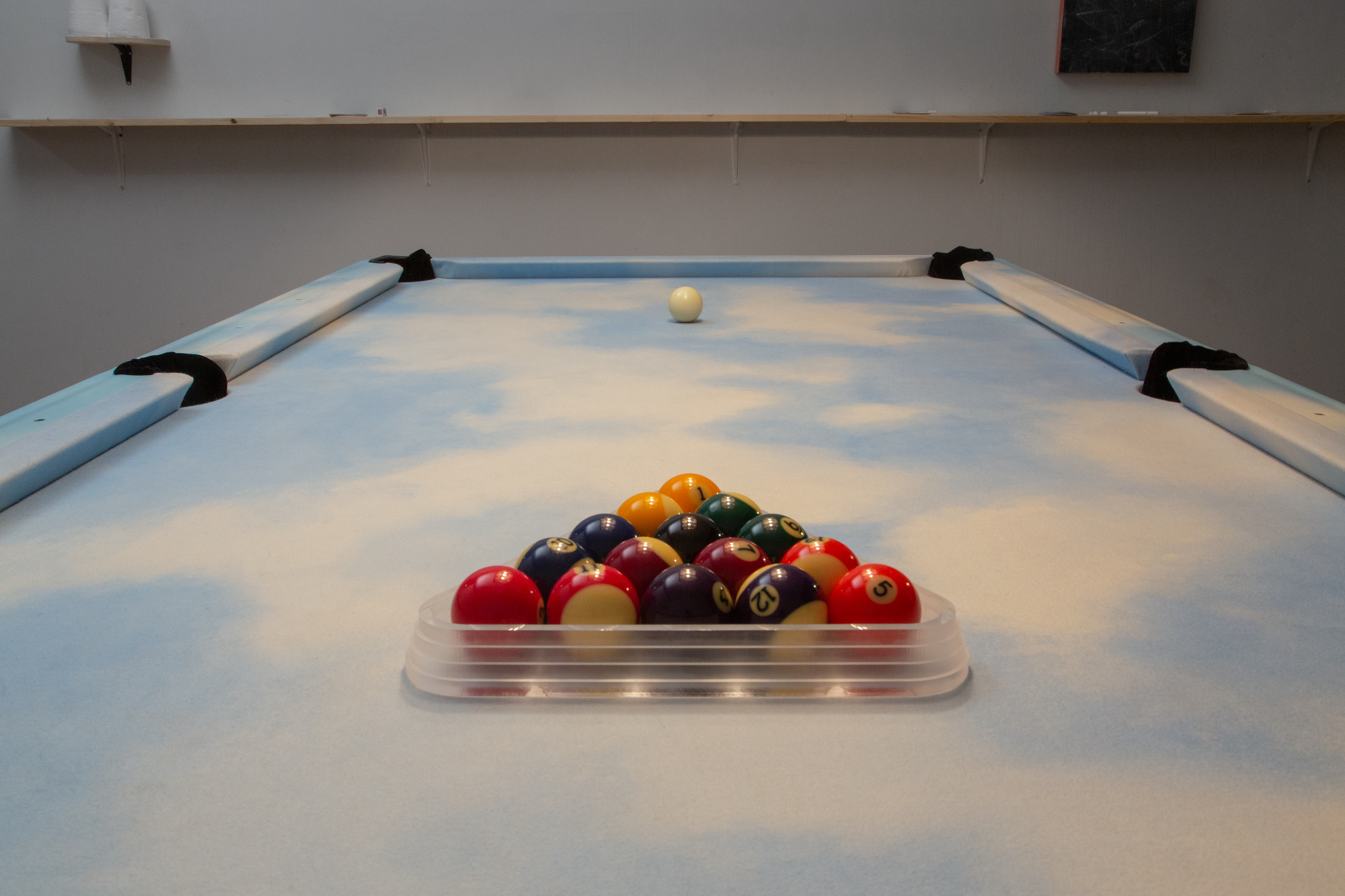 Norman’s billiard table, Heaven Is A Place Where Nothing Ever Happens, offers a glimpse of watching soft clouds float across a blue sky on a beautiful day, except it’s 1AM, 20 degrees out and the only warmth you feel is from the beer you’re drinking and the friends who accompany you. Like any bar that offers but a temporary respite from the shitstorm of life, space and time are turned around, like the seemingly gentle, billowing curves that belie the rigid surface of the table. Bouncing colors disappear into black velvet as you look down upon the sky with only a glimmer of light from the lamp above. You could stay there forever but the game ends and it’s someone else’s turn.